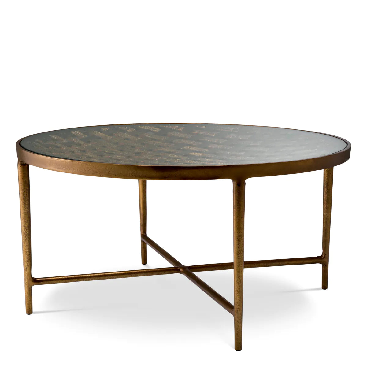 Sorrento soffbord – Vintage charm med glasklar elegans. Lyft ditt vardagsrum med Sorrento soffbord från Eichholtz. Detta unika bord kombinerar en vintage brass-finish med en vävd skålform som syns genom den glasklara glasytan. Varje detalj är hantverksmässigt skapad och ger bordet en sofistikerad mix av tidlös stil och modern design.
