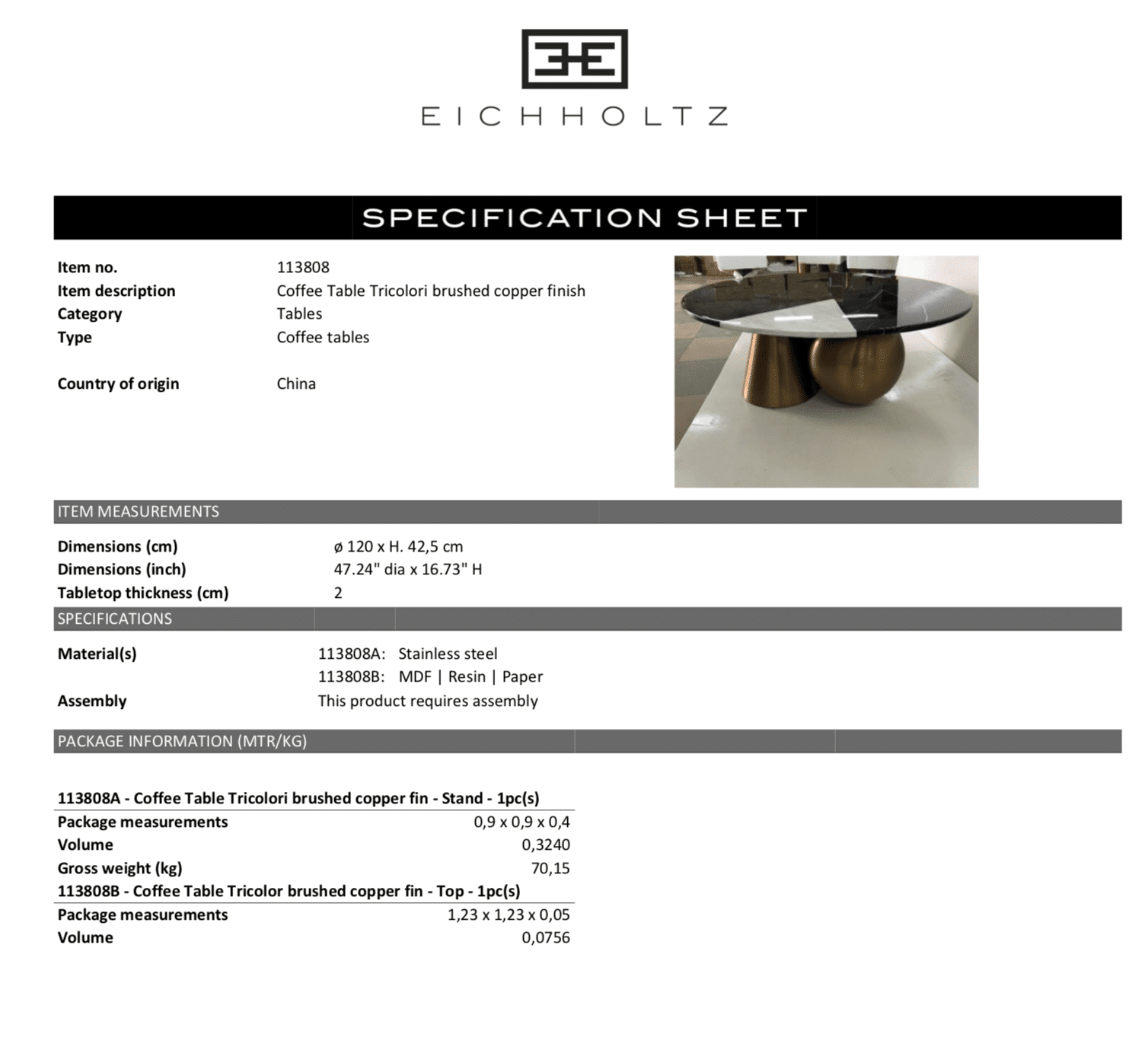 Läckert och annorlunda runt bord med häftig design med en look av svart, brun och vit marmor och geometriska former i underredet i borstad kopparfinish.
