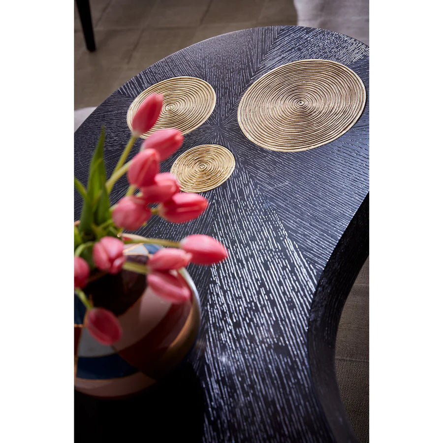 Ett organiskt och mjukt böljande bord i trådborstad och ebenholtsbetsad ek, format som en elegant njure. Detta ekbords unika design framhävs av tre infällda mässingsmedaljonger som är sandgjutna för en autentisk och texturerad finish. De mjukt avsmalnande kanterna ger en subtil sofistikation, medan de slanka benen i polerad mässing lyfter designen med en luftig lätthet.