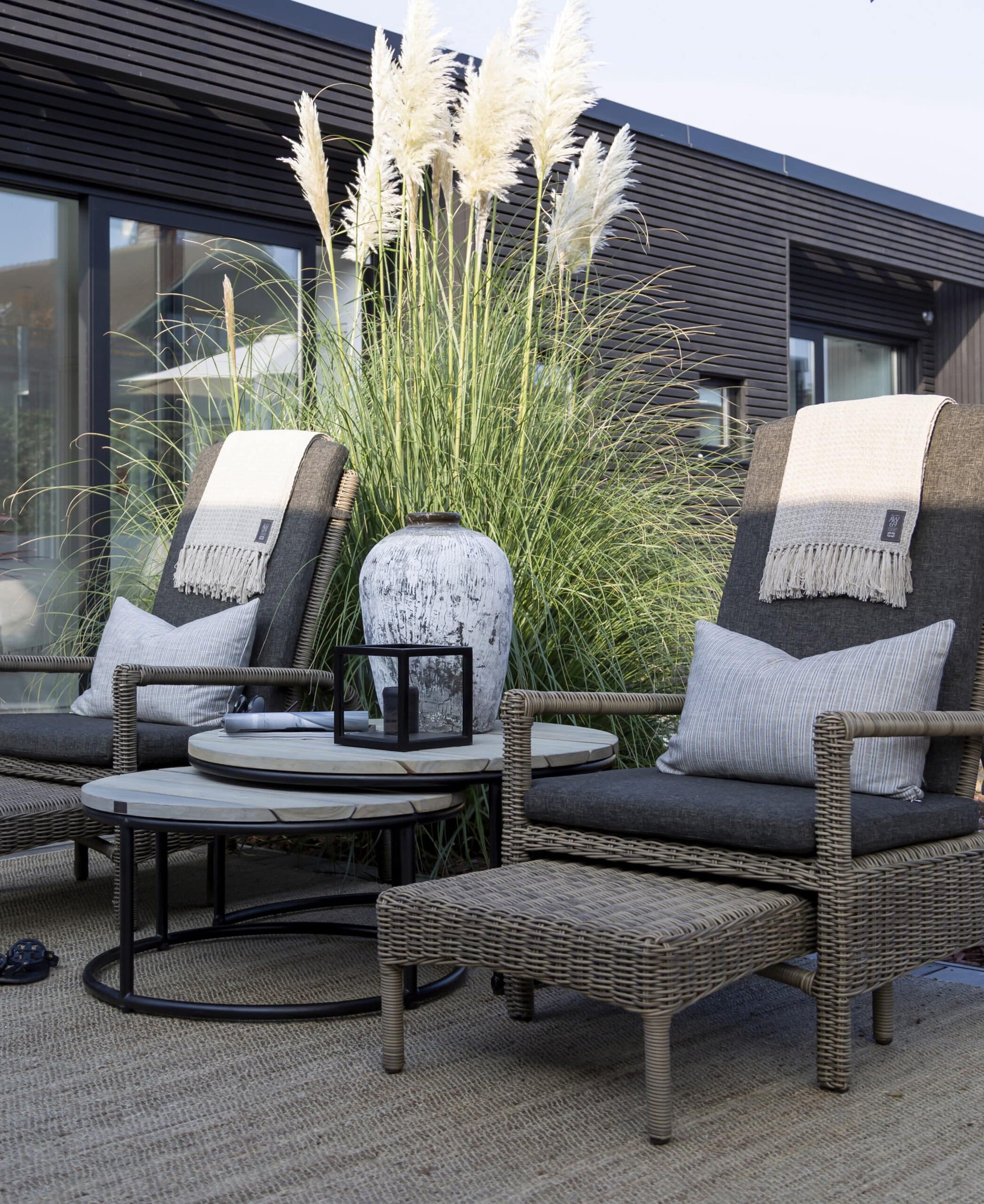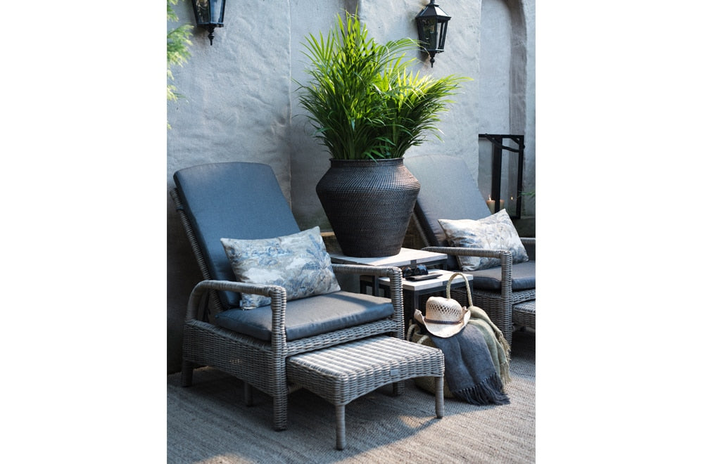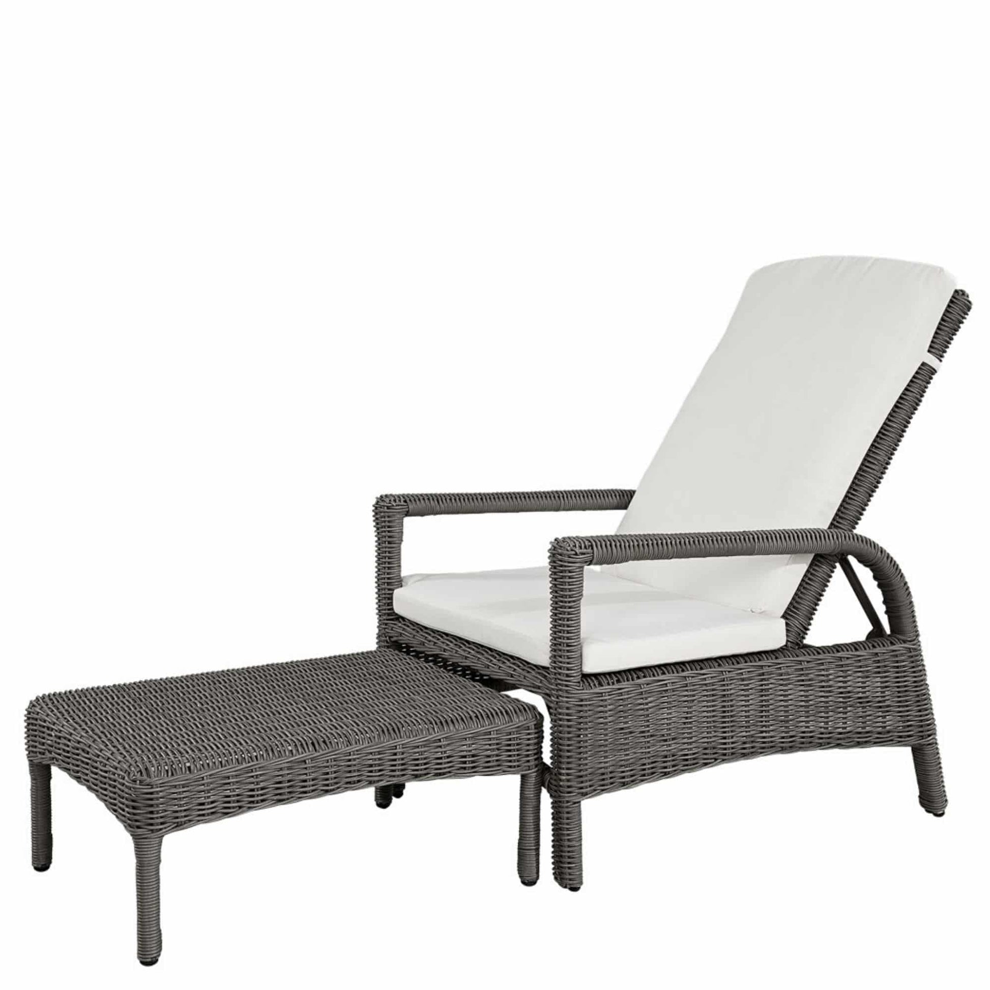 En mycket gedigen solstol med stomme i aluminium och snygg konstrotting som ger ett modernt och luftig känsla. Ställbart ryggstöd och dynor med avtagbar klädsel och fotpall som smidigt skjuts in och ut under stolen till önskad plats.