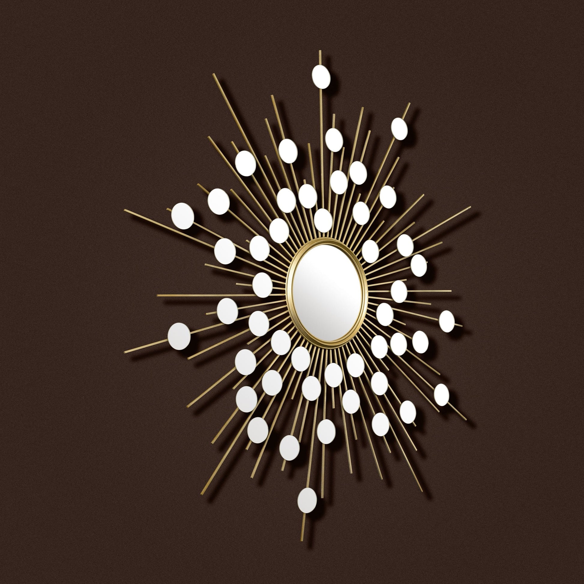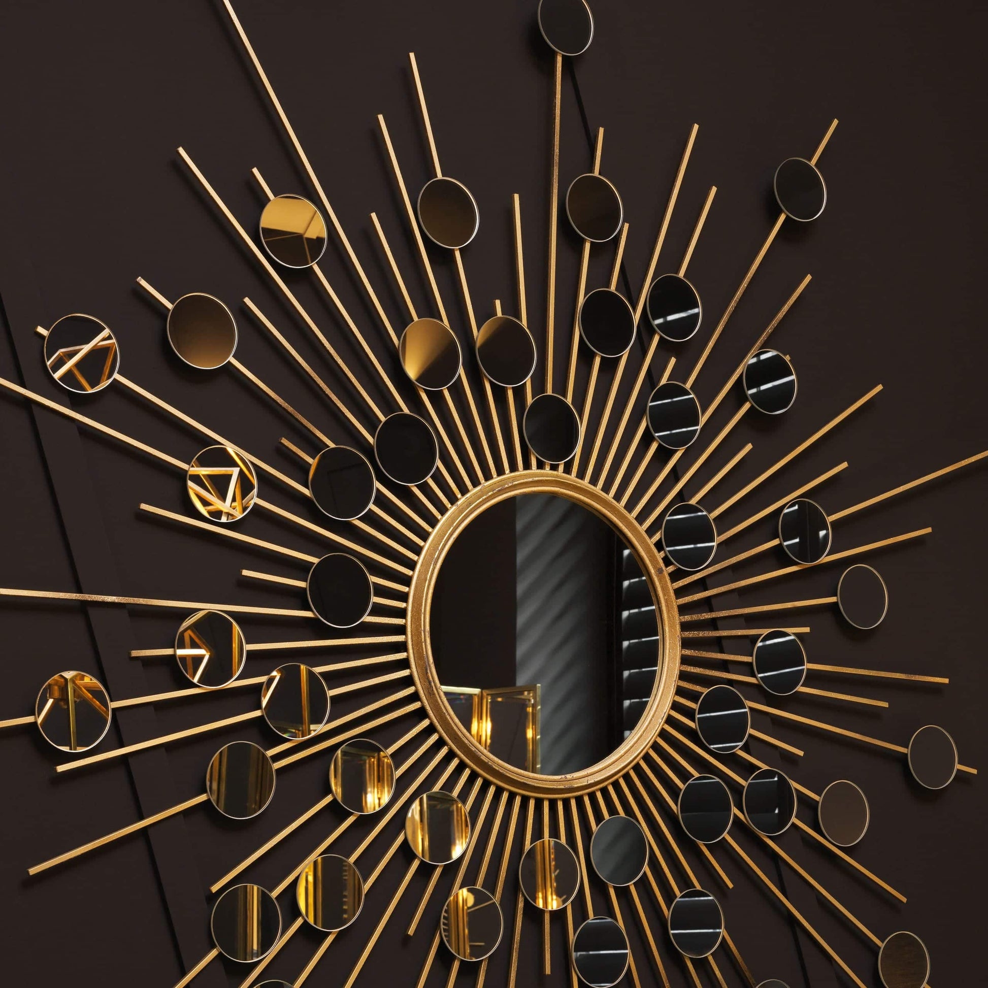 En häftig och otroligt vacker väggspegel med en mängd mindre speglar som omger en liten större spegel i centrum. Exklusivt och väldesignad inredningsdetalj.