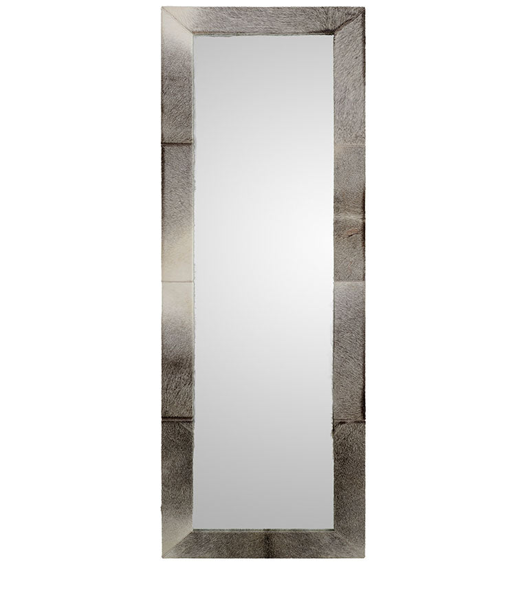 Helskroppsspegel från Artwood designad för att kombinera funktionalitet med sofistikerad elegans. Den robusta stommen är tillverkad av MDF och trä, vilket ger en hållbar och stabil konstruktion. Ramen är klädd i äkta koskinn, vilket tillför en känsla av lyx och en unik textur till designen. Naturliga variationer i koskinnet gör varje spegel helt unik. På baksidan finns ett säkert upphängningssystem i metall som gör det enkelt att montera spegeln och säkerställer att den sitter stadigt på plats.