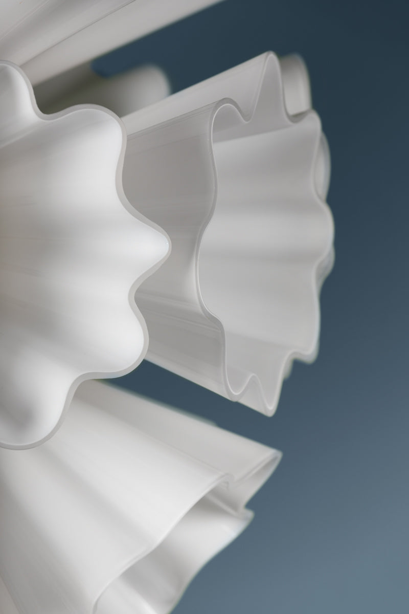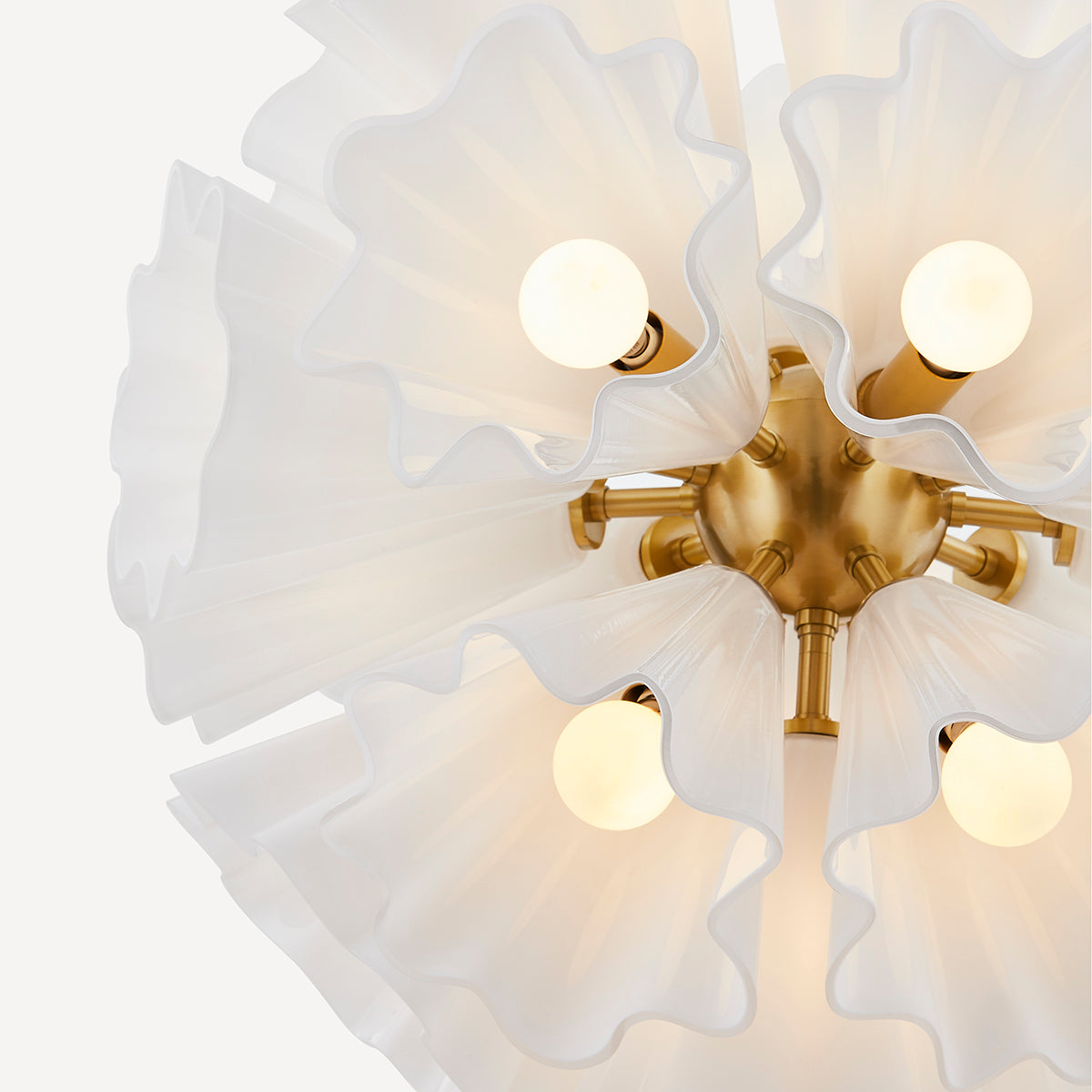 Takkronan Capri från Hudson Valley Lighting Group är en elegant och botaniskt inspirerad tolkning av den klassiska sputnik-designen. Vågliknande, blommiga skärmar i blankt opalglas sträcker sig ut från en central punkt och skapar en naturlig, mjukt rufflad effekt. Trots sin imponerande storlek känns Capri luftig och lätt, vilket gör den till ett perfekt blickfång i rummet. Med sitt harmoniska ljus skapar den en varm, mjuk och rofylld atmosfär i alla interiörer.