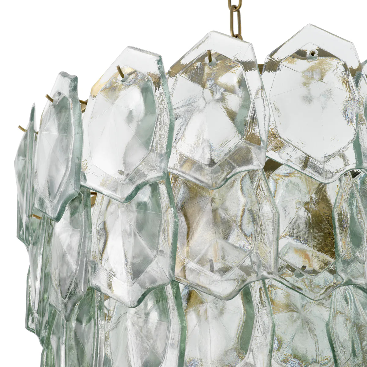 Lampan hänger i en kedja och har en armatur med vintage mässingsfinish, smyckad med över 60 handgjorda glasdetaljer – noggrant tillverkade av skickliga hantverkare.