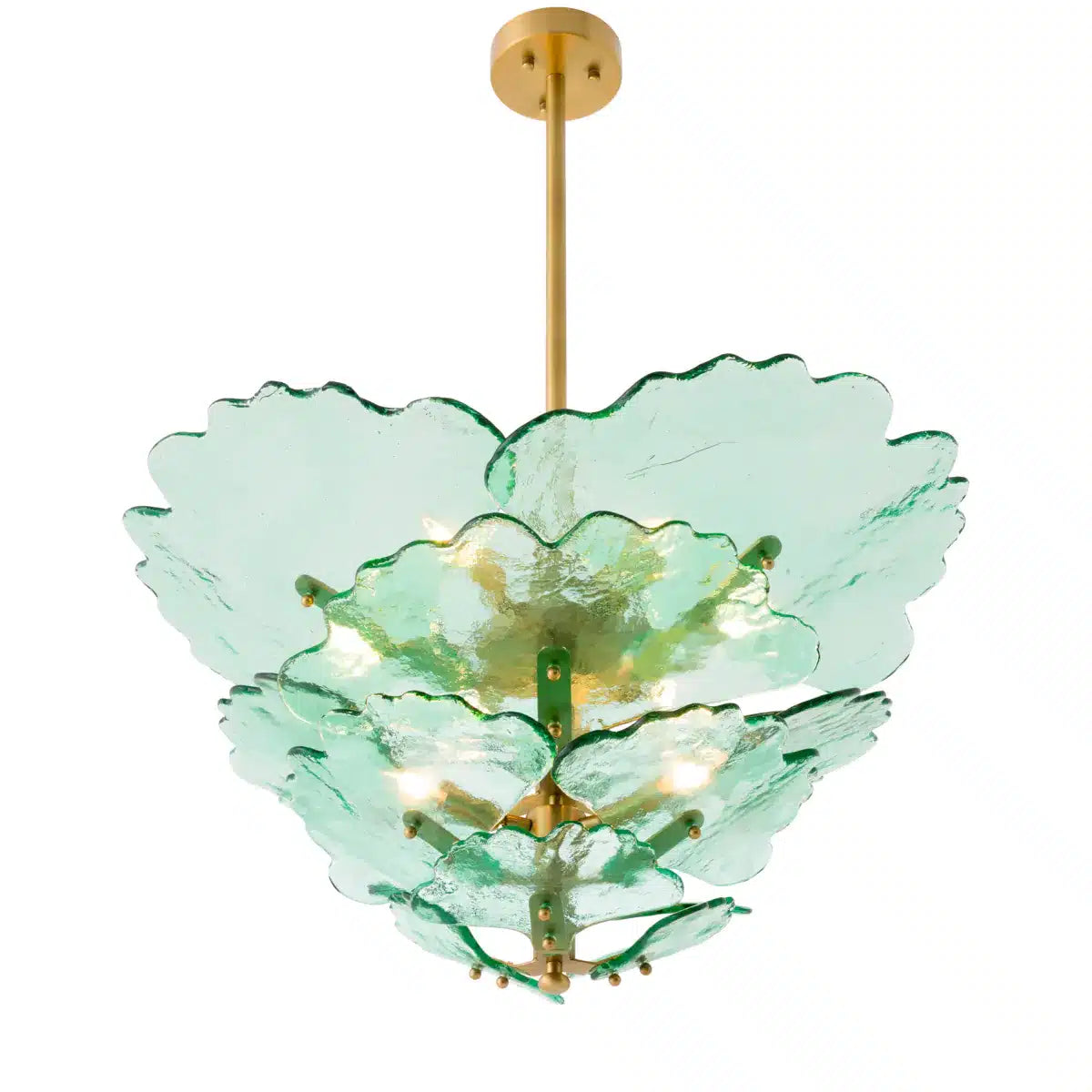Denna exklusiva takkrona kombinerar en antik mässingsfinish med vackert handgjort grönt glas, vilket ger ett sofistikerat och naturligt uttryck. De stilfulla glasdetaljerna fångar och reflekterar ljuset på ett sätt som skapar en varm och inbjudande atmosfär i rummet. Florina är den perfekta belysningslösningen för dig som vill addera en subtil färgaccent samtidigt som du bevarar en tidlös elegans. Oavsett om den placeras i vardagsrummet, matsalen eller en exklusiv hotellmiljö blir den ett raffinerat blickfång.