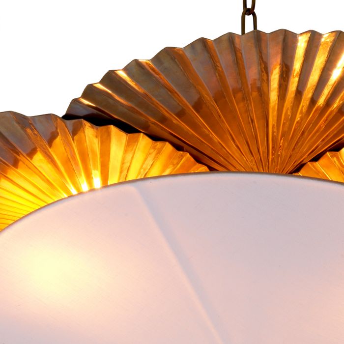 Takkronan Oriental är inte bara en vanlig taklampa; den är ett verkligt konstverk som lyfter fram en sofistikerad och elegant atmosfär i ditt hem. Den vintage brass-finishen ger en tidlös och klassisk känsla till rummet, medan den vita linneskärmen lägger till en touch av mjukhet och lyx. Varje detalj är noggrant utformad med enastående hantverk och kvalitet, vilket ger en känsla av exklusivitet och raffinement till hela utrymmet. Kronan Oriental är inte bara en ljuskälla; den är ett statement-piece som tillför en känsla av glamorös elegans och en touch av mystik till ditt hem.