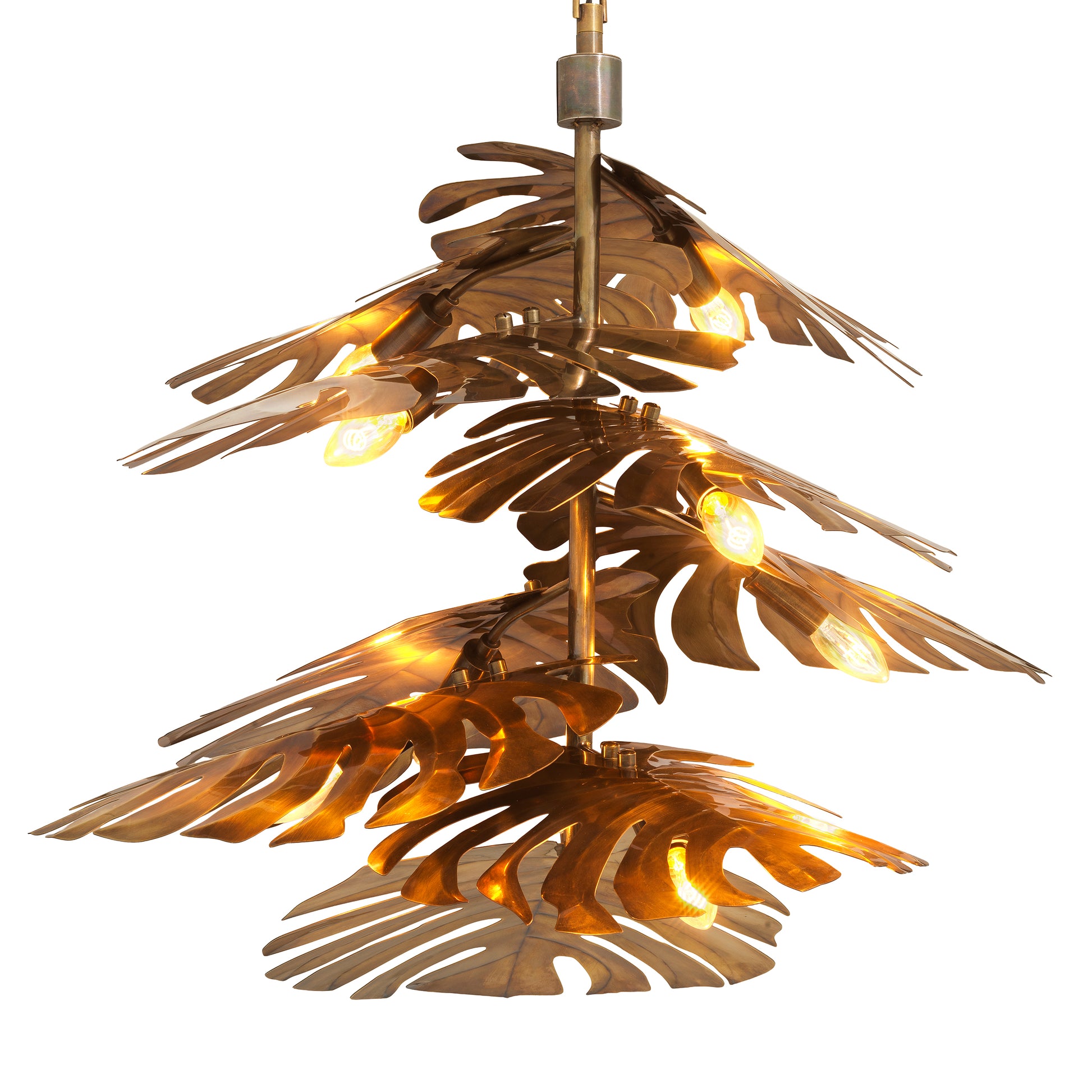 Takkrona Tropique från Eichholtz inspireras av de frodiga formerna hos Monstera-växten och för in tropikens känsla i hemmet. Tillverkad med vintage-mässingfinish, skapar de lager-på-lager av blad en skulptural elegans och naturlig skönhet, samtidigt som ljuset sprids med en förfinad glöd som utstrålar diskret lyx och tidlös sofistikering.