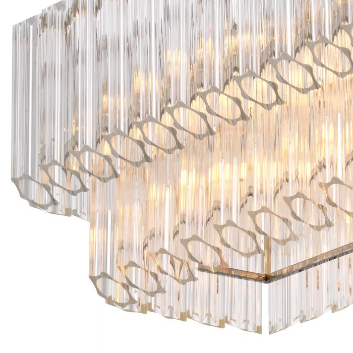 Skapa glamour och storslagenhet i din heminredning med den rektangulära taklampan Vittoria. Med en bländande design med ribbade och fasade glasrör i klart glas skapar den här ljuvliga ljuskronan i nickelfinish en fantastisk glöd i varje interiör som den pryder.