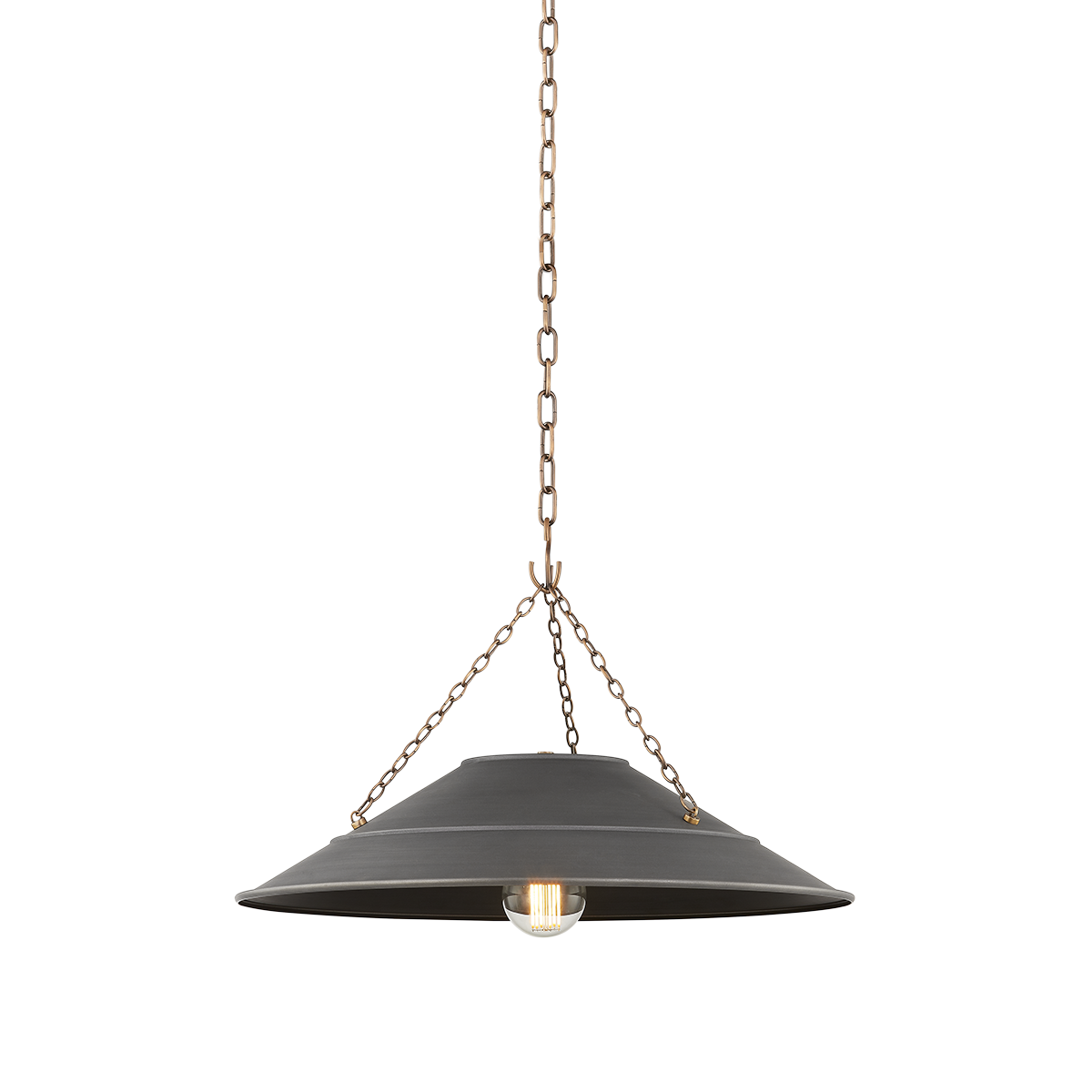 Arcane Taklampa från Hudson Valley Lighting Group – del av Lauren Liess-kollektionen. Arcane har en sofistikerad, industriell estetik med synlig metallkonstruktion, kedjedetaljer och en unik kombination av finishar. Den grafitfärgade skärmen ger ett elegant intryck och sprider ett varmt sken. Patinerad mässing i kedjan, takkåpan och övriga detaljer tillför en subtil glans som harmonierar vackert med grafiten. Den tvinnade svarta tygsladden är en genomtänkt detalj som förstärker lampans vintagekänsla.