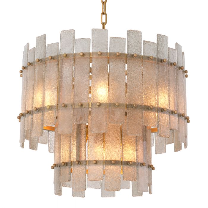 Taklampa Caprera presenterar en sofistikerad modern twist på en klassisk design. Tillverkad i en vintage mässingsfinish och med 10 lampor i en avsmalnande design i två nivåer. Dropparna är gjorda av handblåst glas med en ruggad baksida, vilket ger en häpnadsväckande effekt när lampan är tänd.