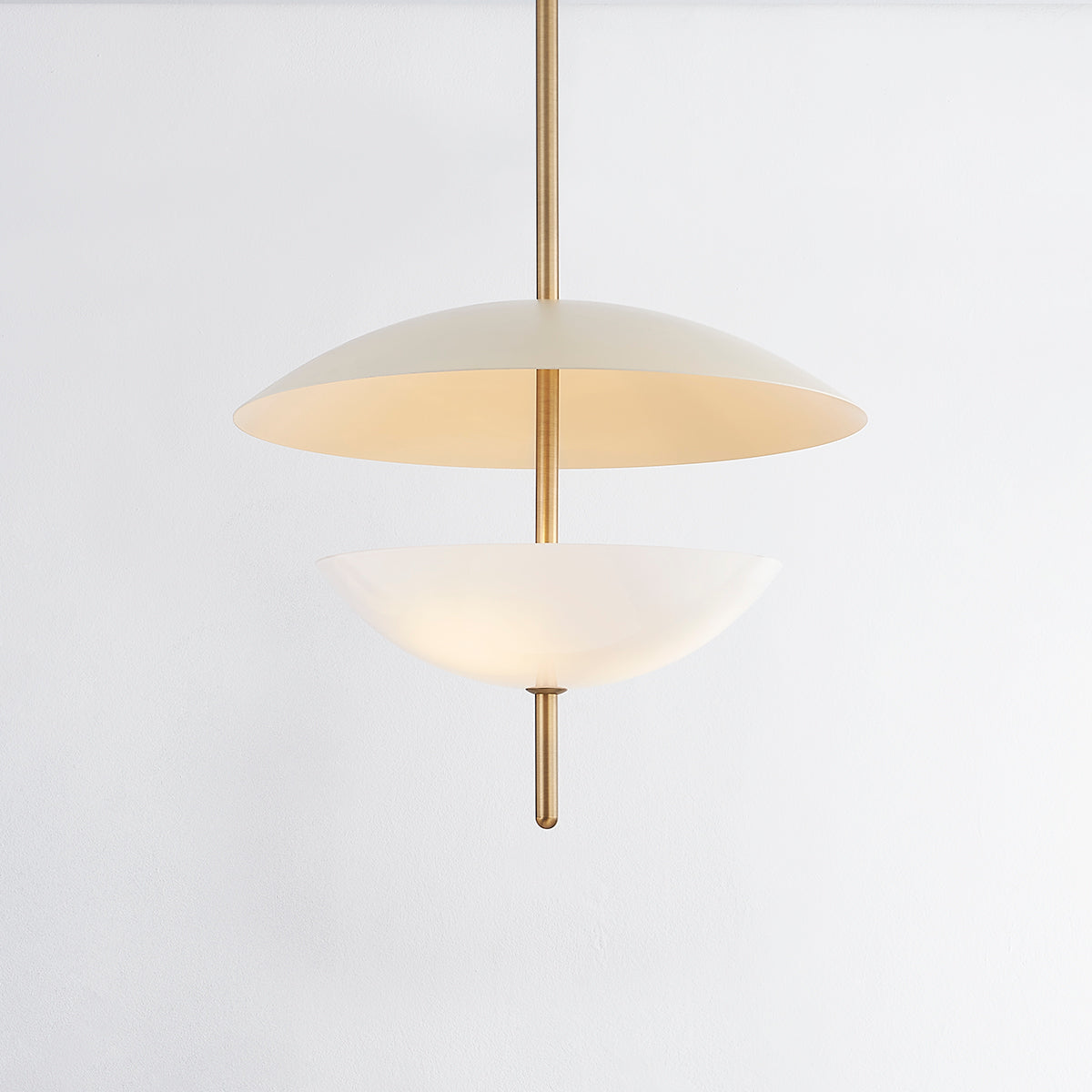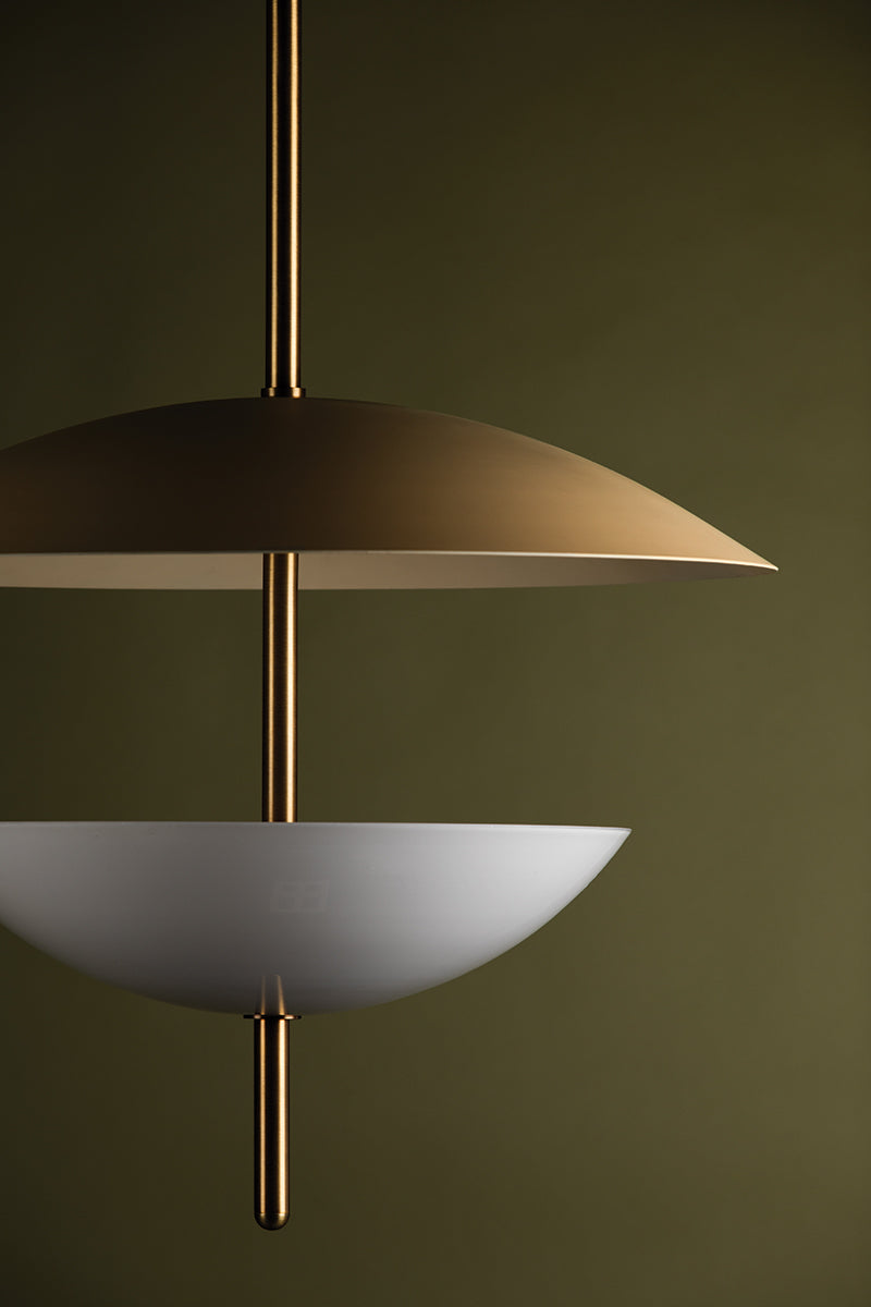 Dion förkroppsligar modern organisk design med sin eleganta, runda stång i patinerad mässing som genomborrar två välvda skärmar i varma, neutrala toner. Den blanka opalglasgloben nedtill sprider ett mjukt och behagligt ljus, medan den större skärmen i Soft Sand ovanför reflekterar ljuset uppåt och skapar en inbjudande atmosfär. Med sin subtila sofistikation och harmoniska form blir Dion en stilfull och tidlös detalj i alla interiörer.