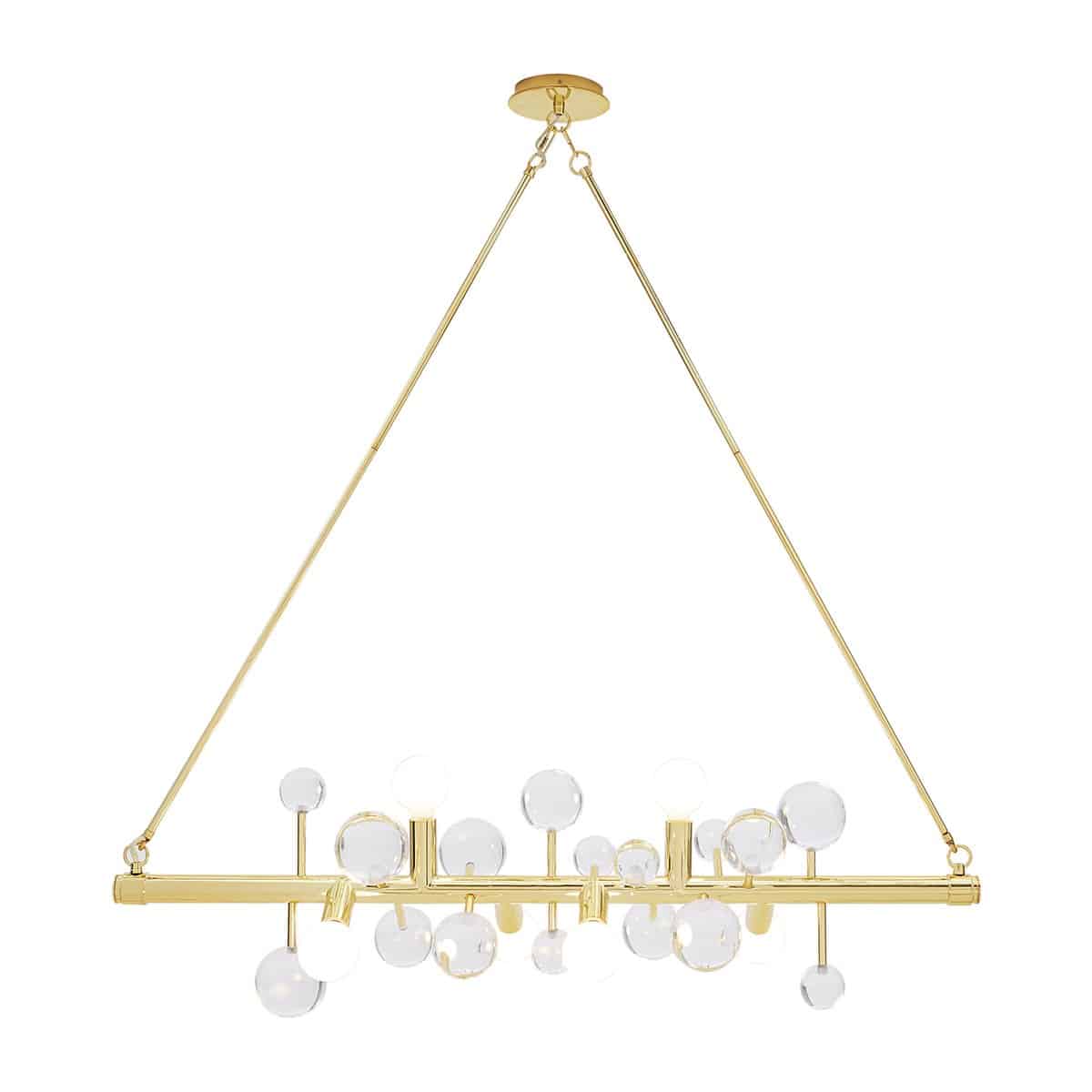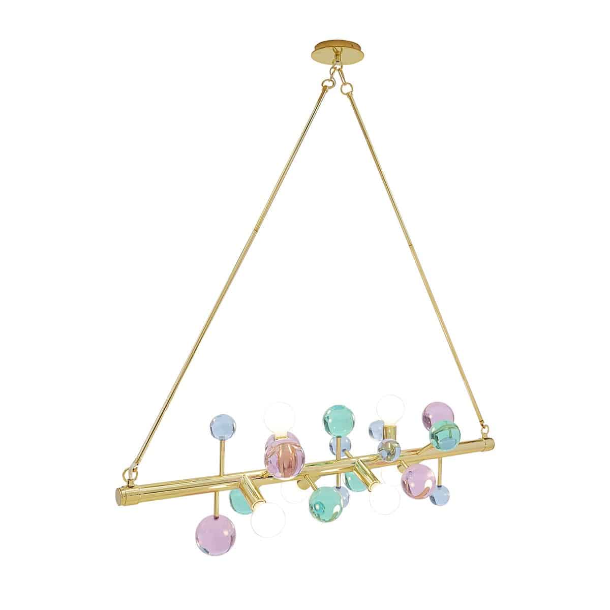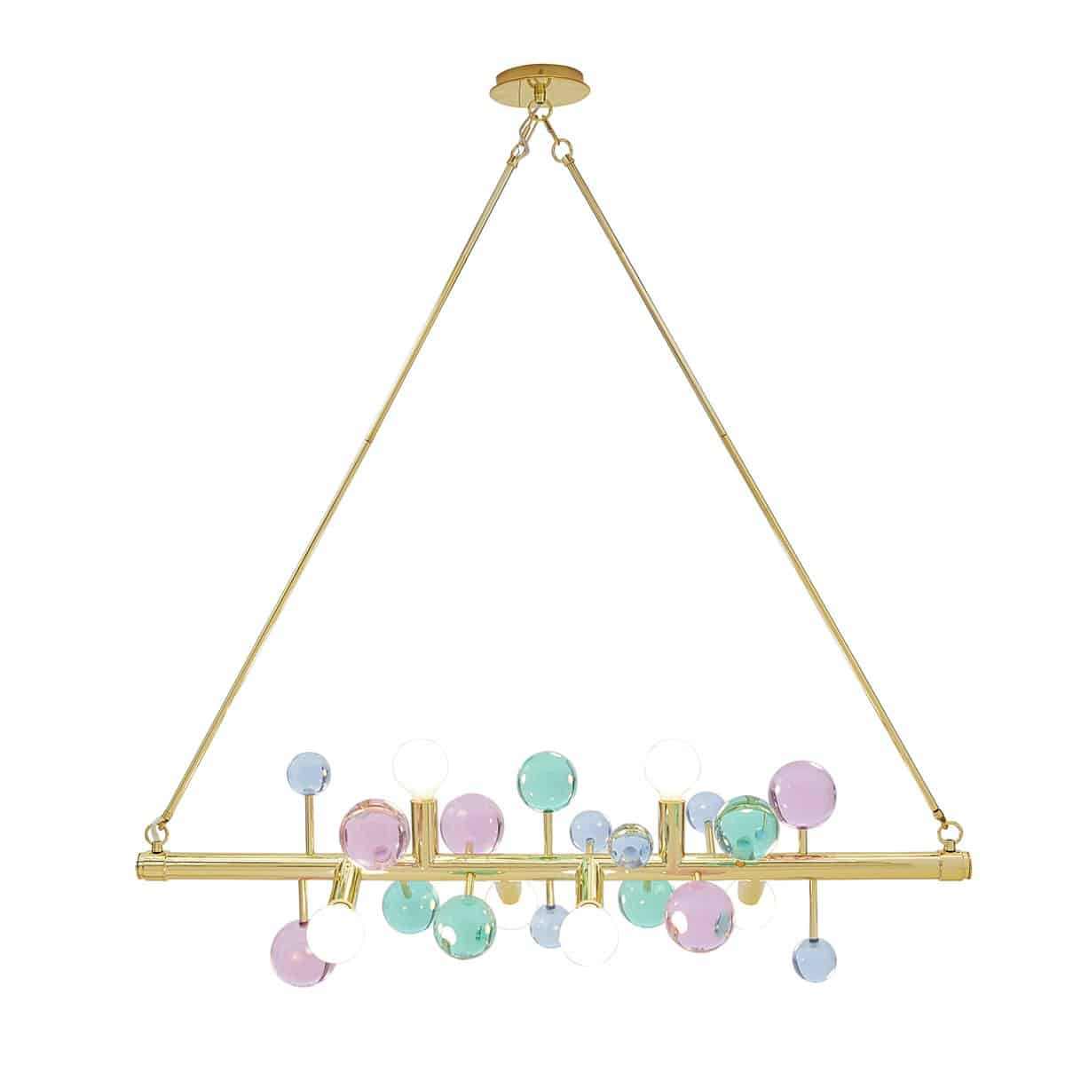 A dazzling line of light suspended from two brass rods, our Globo Six-Light Linear Chandelier features a polished brass bar dotted with jewel-toned acrylic spheres and globe bulbs. Jewelry to swag above your dining table, it’s a little industrial, a little fancy, and a lot glamorous.