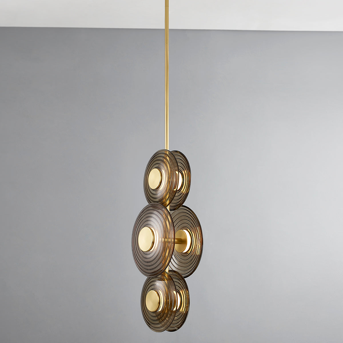 Griston fångar en glamorös retroestetik med sin eleganta design. Skivor av räfflat, rökfärgat glas, avslutade med detaljer i åldrad mässing, påminner om krusande vågor och skapar ett sofistikerat uttryck. När lampan tänds sprider den ett varmt, gyllene sken och ger precis rätt mängd lyster till rummet.