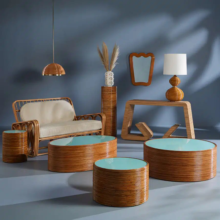 - Coiled and stacked rattan finished with a honey-toned stain and glossy lacquer