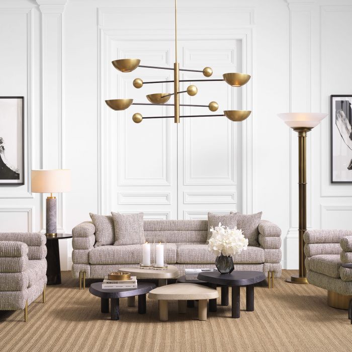 Ljuskrona Salinas kommer på ett mycket läckert sätt att lysa upp ditt vardagsrum eller matsal med sin design och eleganta utseende inspirerad från århundradets mitt. Denna taklampa med mässingsfinish är inte bara slående utan också mycket praktisk tack vare sina 5 skålformade lampskärmar som kan vinklas för att rikta ljuset. De låter ljuset lysa genom ett matt glas på ett speciellt, annorlunda och dekorativt sätt. Flera längder på rör för att fästa i taket medföljer så man kan kombinera till önskad längd.