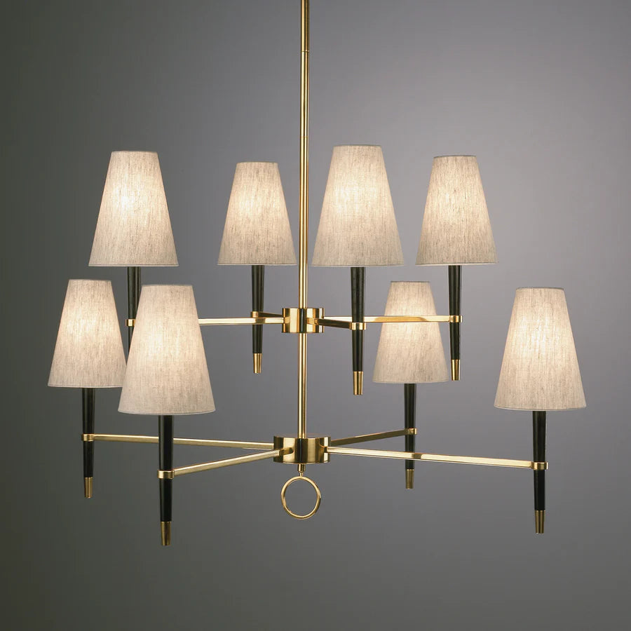 Adlers Ventana takkrona i två våningar är elegant och sofistikerad i elfenbensfärgat trä med detaljer i polerad nickel, eller tidlöst stilfull i eboniserat trä med detaljer i antik mässing eller polerad nickel. Toppad med skärmar i naturligt linne.