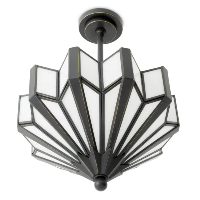 Taklampa Victory från Eichholtz är en elegant designlampa skapad i samarbete med den välkända amerikanska inredningsdesignern Corey Damen Jenkins. Lampan är inspirerad av Art Deco-erans arkitektur och formspråk och kombinerar geometrisk precision med modern elegans. Designen kännetecknas av sina lagerformade glaspartier som skapar ett mjukt och behagligt ljus i rummet. De alabasterfärgade glasdelarna sprider ljuset jämnt medan den mörka metallramen med bronze highlight finish ger lampan en sofistikerad kontrast och ett exklusivt uttryck. Formen för tankarna till klassiska Art Deco-byggnader och ger lampan en arkitektonisk karaktär som gör den till ett stilfullt blickfång.