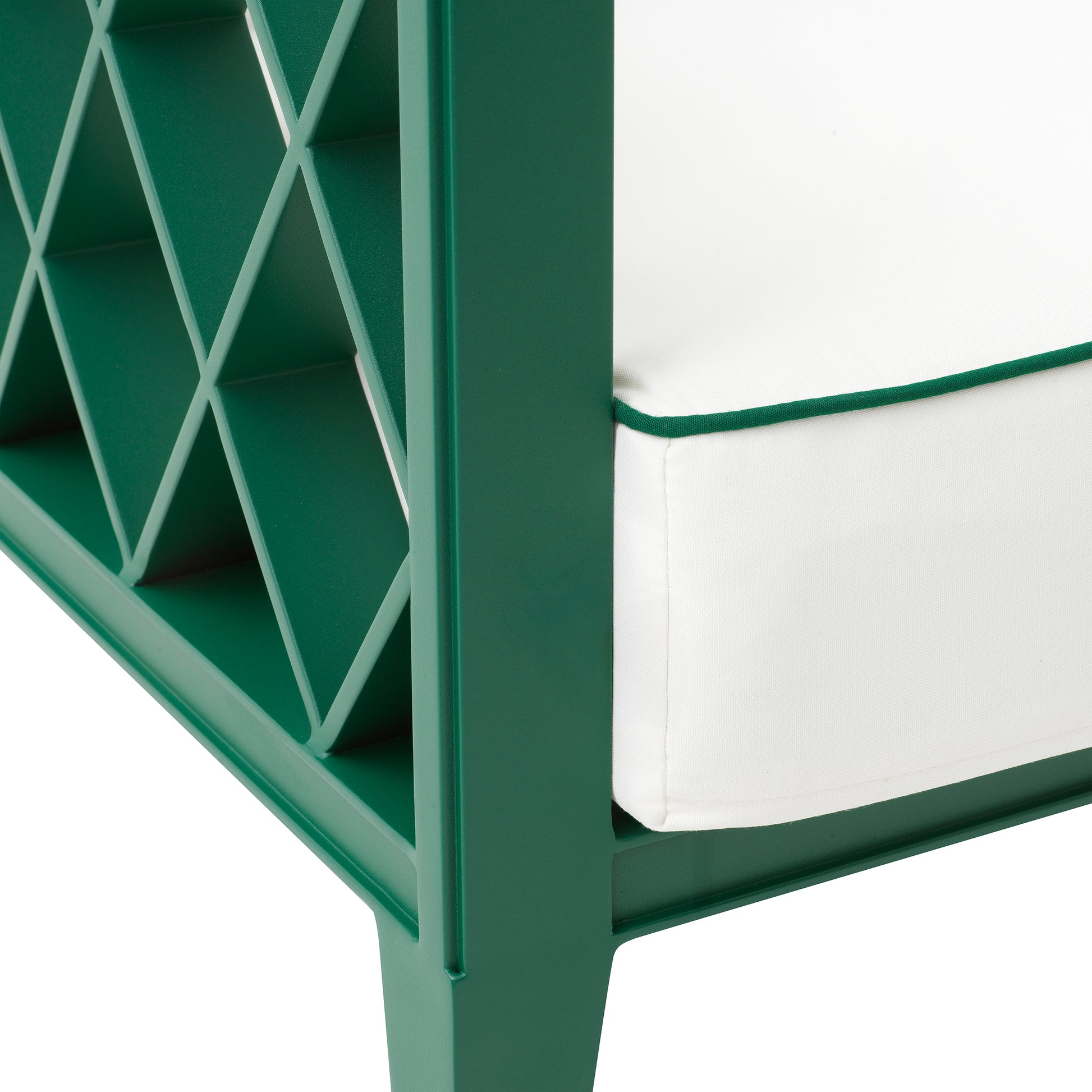 Denna generösa fåtölj är ett elegant tillskott till uterummet eller din uteplats. Tillverkad i slitstarka material för att kombinera tidlös design med hållbarhet. Den har en mattgrön ram och mjuka kuddar som ger en bekväm sittupplevelse för både dig, familjen och dina gäster. Kuddöverdragen är prydda med stilrena kontrastpasspoaler för en extra sofistikerad känsla.