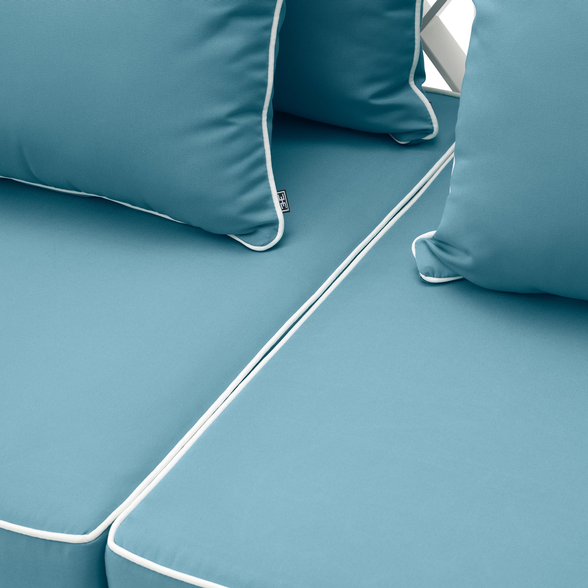 Denna lyxiga soffa från Eichholtz har Sunbrella-klädsel i mineralblått och en elegant vit ram. Den raffinerade designen och de mjuka kuddarna ger den ultimata utomhusupplevelsen, där du och dina gäster kan koppla av med stil och komfort. Perfekt för dig som söker tidlös skönhet till din uteplats. Kuddöverdragen i Sunbrella är avslutade med kontrasterande passpoaler. Serien finns som tvåsitssoffa, tresitssoffa, fåtölj och blomkruka – alla i tre färgkombinationer.