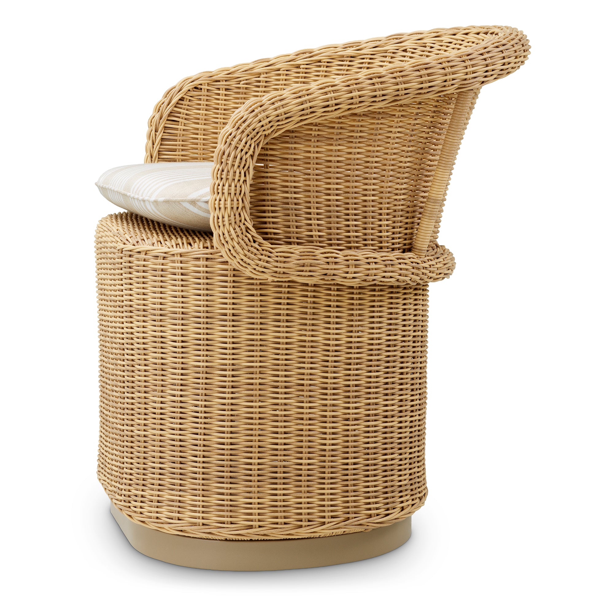 Utomhusmatstolen San Remo från Eichholtz förenar hållbar konstrotting med ett rogivande Saville Beige-tyg och skapar en sofistikerad känsla av utomhusavkoppling. Den mjuka, randiga beige dynan bjuder in till lyxig komfort, medan den eleganta flätningen och de dämpade tonerna ger en harmonisk och stilfull atmosfär. Perfekt för dig som vill lyfta ditt utomhusliv med subtil, men iögonfallande design.