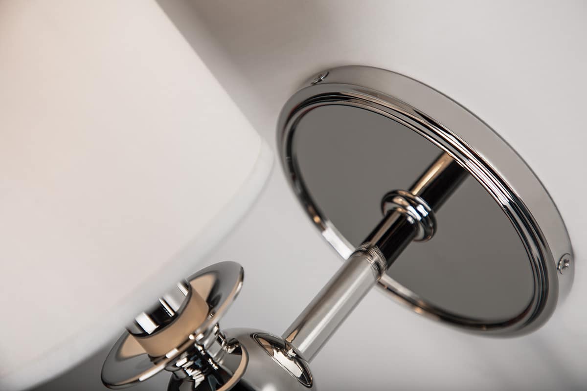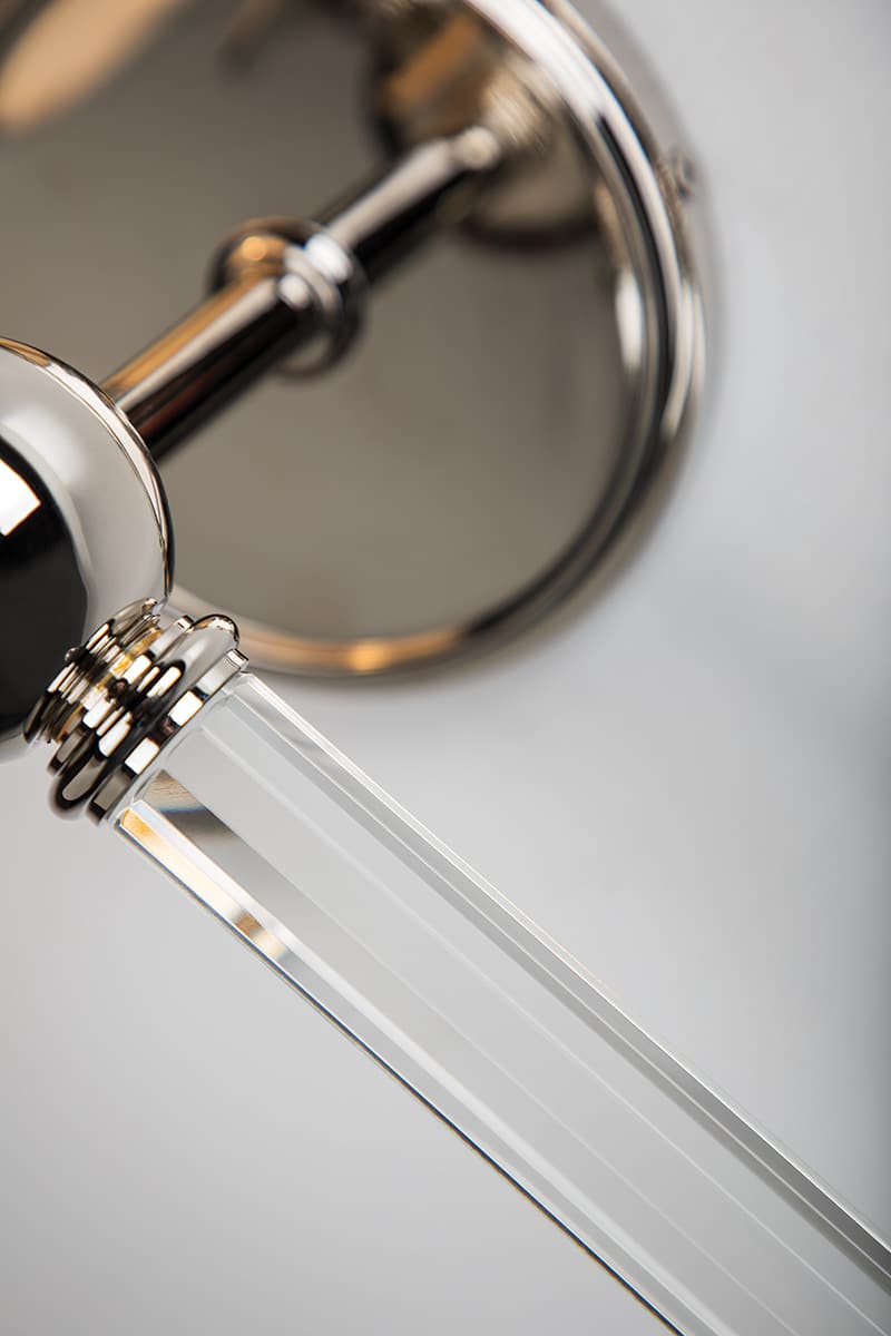 Using an intriguing blend of materials, this sconce features a long arm of faceted crystal against handsome metal-work to produce a visually striking piece. The crystal arm lends an airy grace to the fixture, while a finely-proportioned silk shade gives forth a suggestion of royalty.
