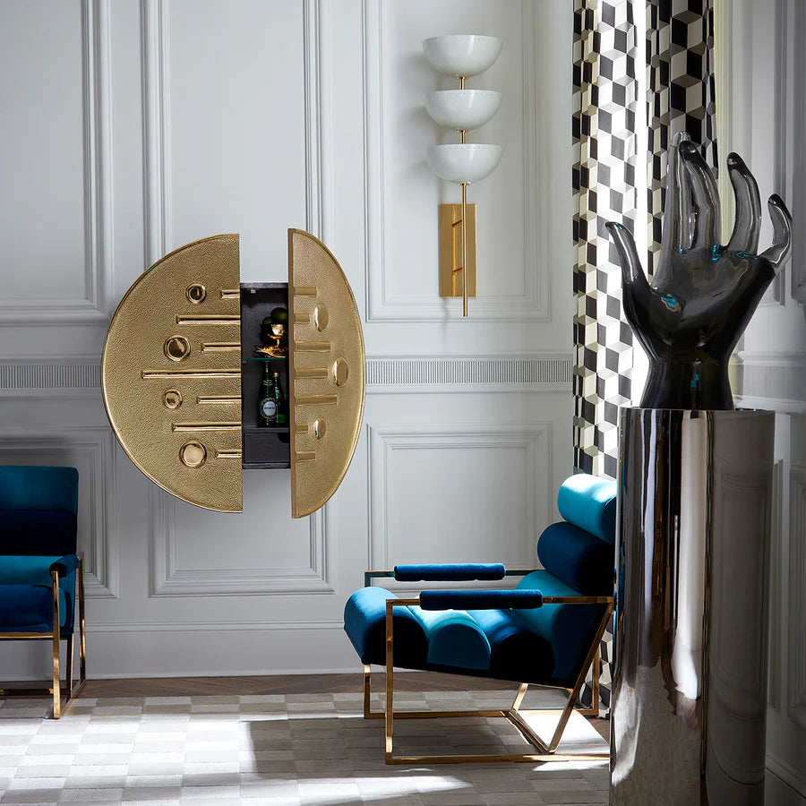 Stor och imponerande, vår vägglampa Lisbon från Jonathan Adler är en glamorös detalj som är lika elegant i en studio som i ett italienskt palats. En polerad mässingsstam bär upp tre halvsfärer av elfenbensfärgad emaljerad metall med subtila runda perforeringar. Med sin mjuka elfenbensfärg och varsamma uplight balanserar Lisbon Sconce en stark närvaro med diskret glamour.