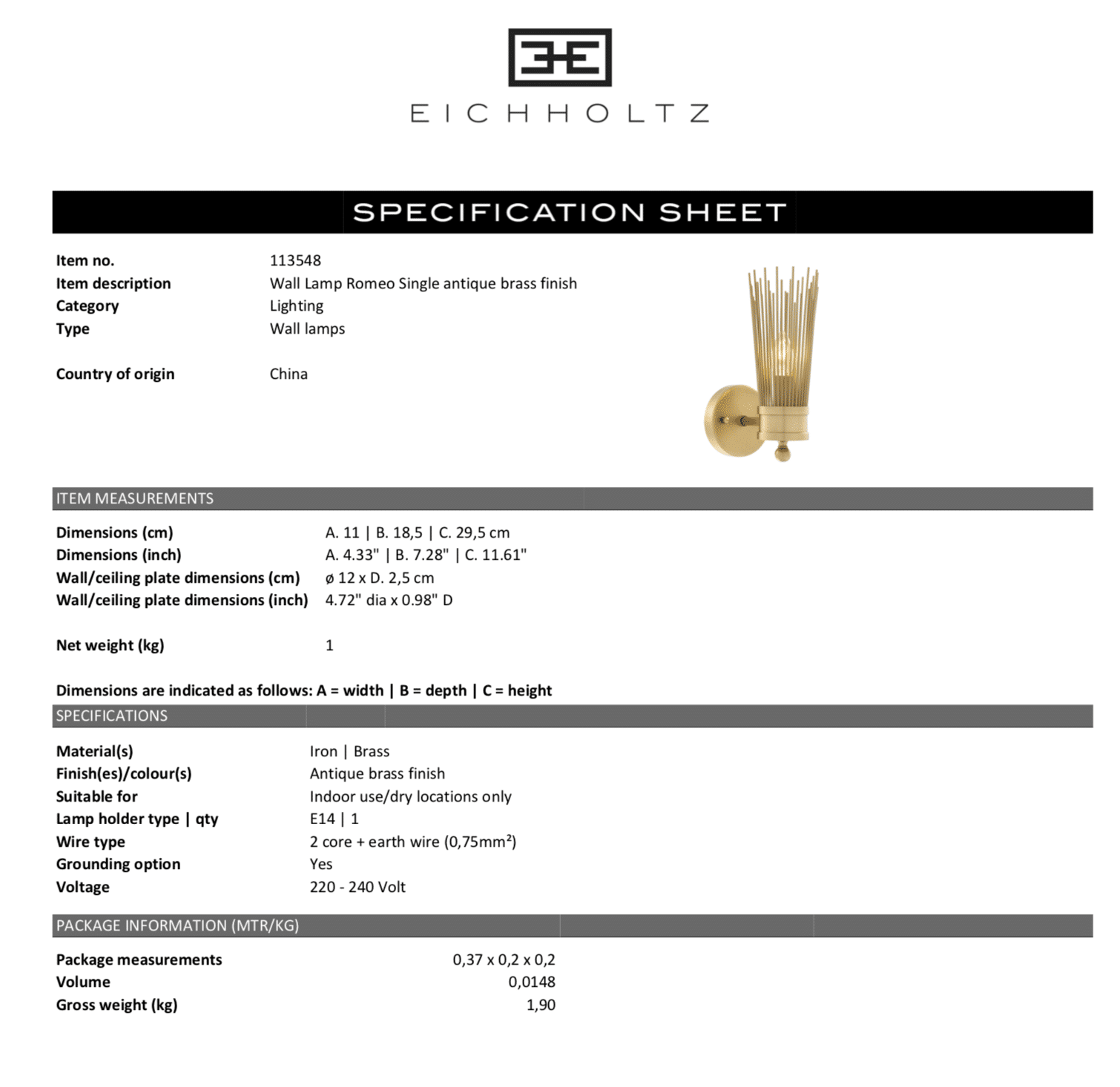 Romeo, en vägglampa som stoltserar med en slående design, och kastar ett dekorativt ljus på väggen och omgivningen. Denna moderna vägglampa har en antik mässingsfinish och passar många olika interiörer och inredningar.