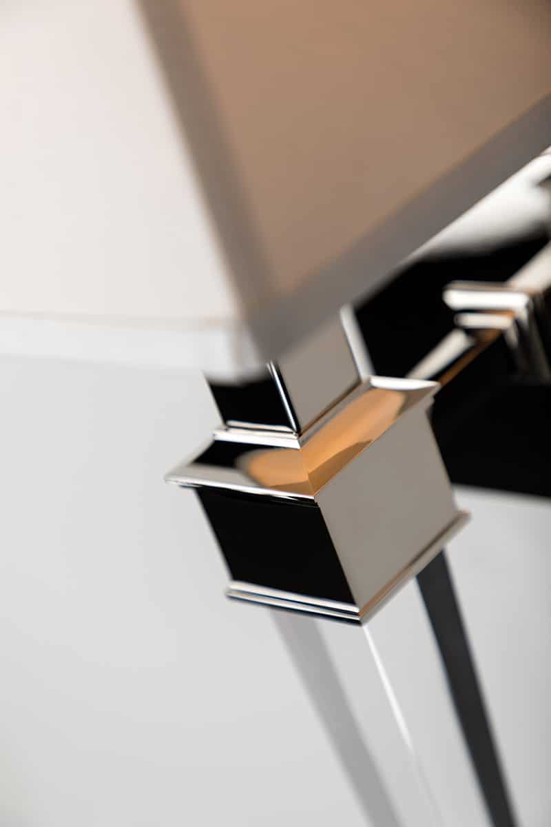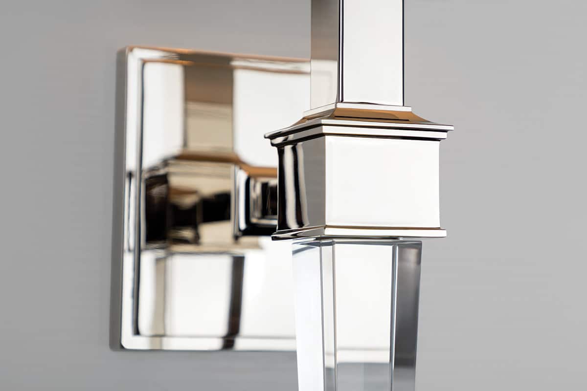 Refreshing about Ruskin is the way it combines masculinity and femininity in one elegant design. The handsome cubic principle that occupies much of the piece is complemented by the glamour of a long, faceted-crystal tail, ending in a singular sphere on the finial. Reflecting the tail’s design is a tapered square shade. The simplicity of the geometry paired with the combination of metal and crystal sets this sconce apart.