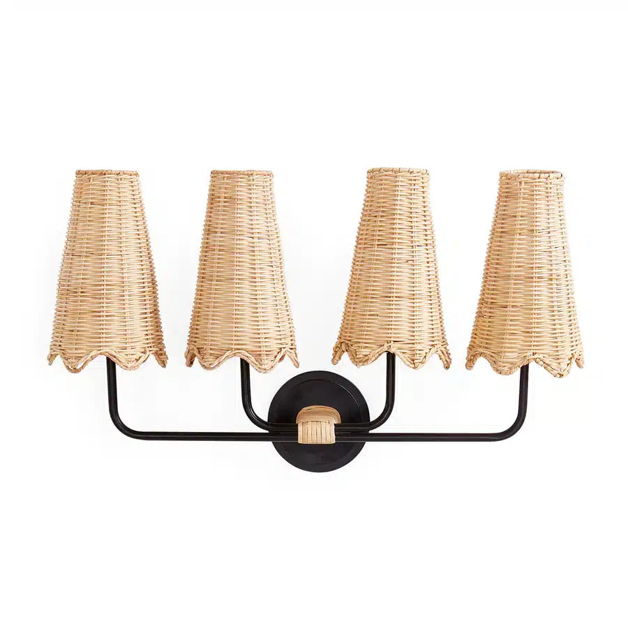 Med en skulptural ram i svärtat stål, detaljer insvepta i flätad rotting och toppad med vävda lampskärmar med vågformade kanter, förmedlar vår Wellington Four-Arm Sconce en avslappnad Palm Beach-känsla. Perfekt för att ge en sofistikerad touch till din gästtoalett eller entré.