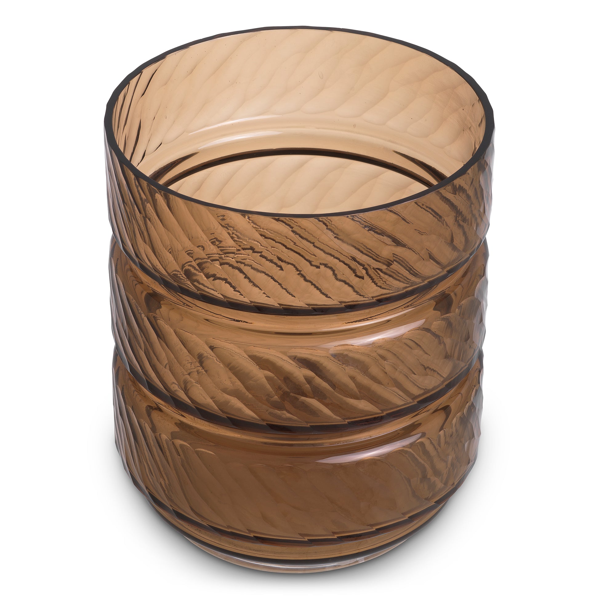 Det handskurna mönstret skapar ett vackert ljusspel i glaset och ger vasen ett sofistikerat uttryck. Den varma kopparfärgen tillför en mjuk och elegant känsla som lyfter både matsal, vardagsrum och hall. Perfekt som centerpiece på ett matbord från Eichholtz eller som dekorativ detalj på ett sideboard eller konsolbord.