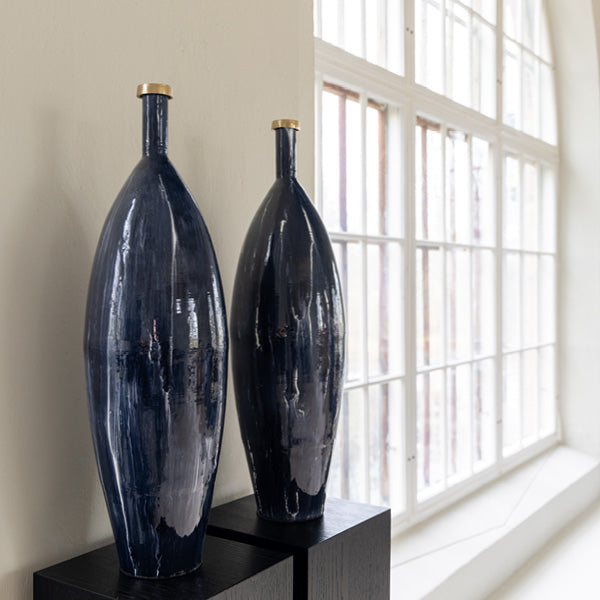 Unik vas från Artwood tillverkad av handemaljerad metall med en blank och glansig yta i färgen Indigo. Varje vas är ett konstverk i sig, med subtila variationer i utseende som ger den en personlig och exklusiv prägel i din inredning. Denna vas fungerar lika bra som en dekorativ detalj som för att framhäva blommor eller kvistar på ett bord, en skänk eller i en hylla.