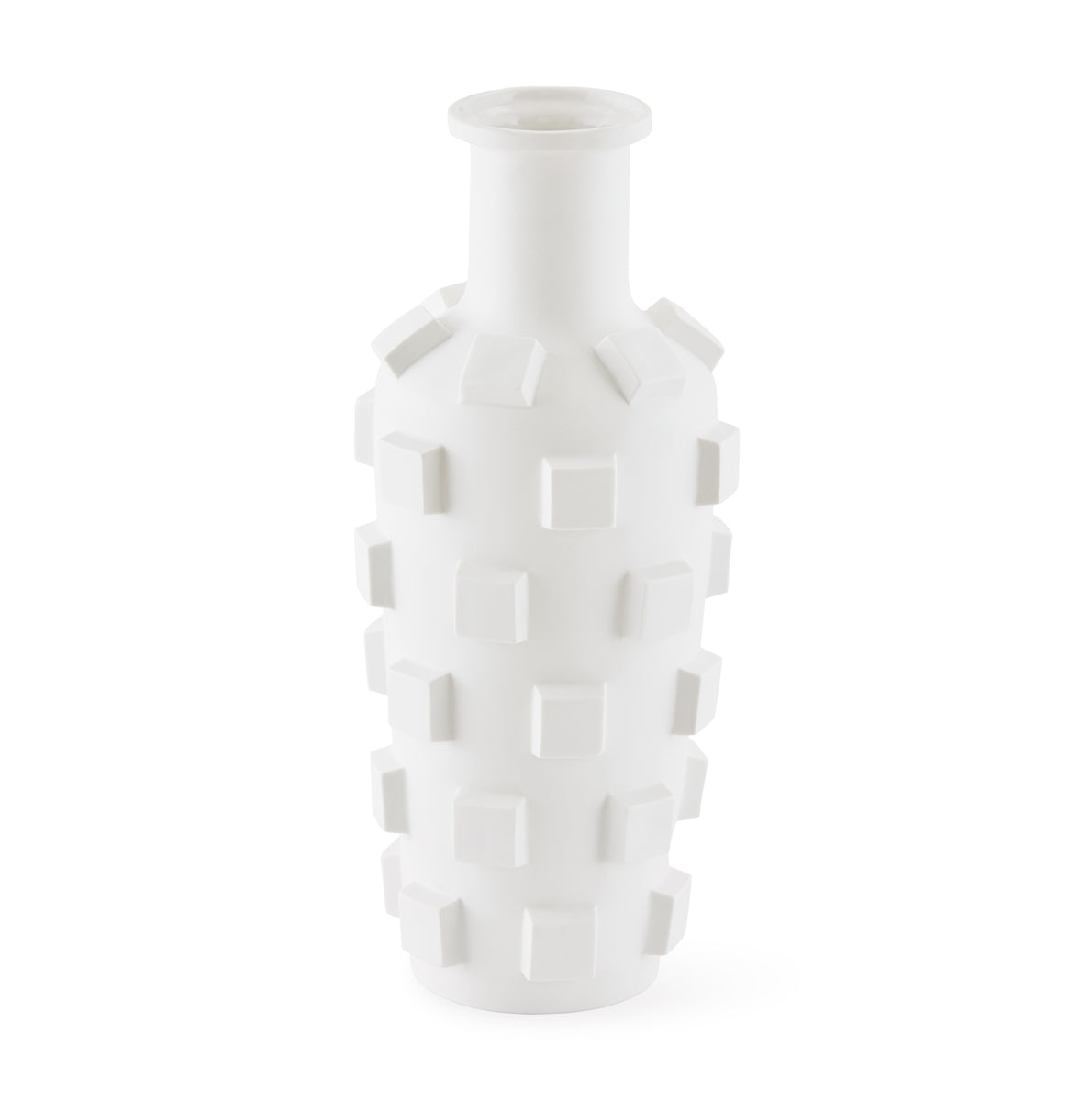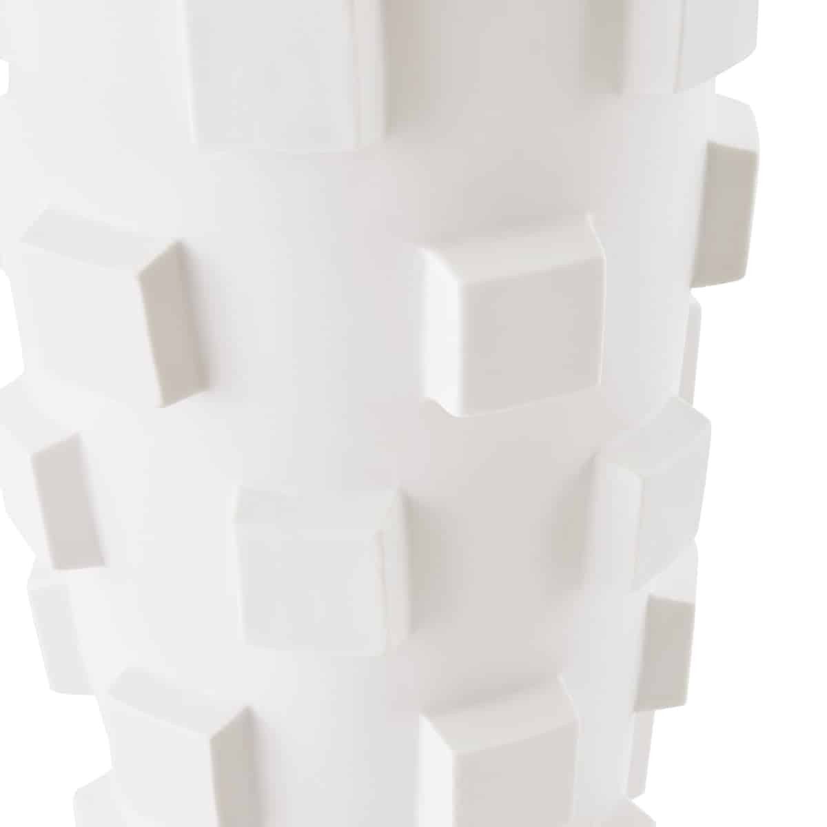Här har Adler tagit sin klassiska porslinskollektion och ersatt nitar med Brutalist-inspirerade barer och block för en modern, Memphisy twist. En oglaserad utsida ger dimension.