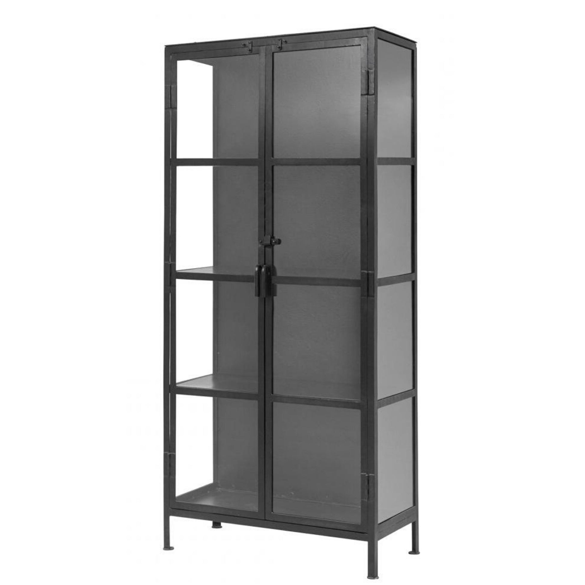 Ett härligt och snyggt vitrinskåp i svartlackerad metall, glasdörrar och glassidor som fint släpper in ljuset.