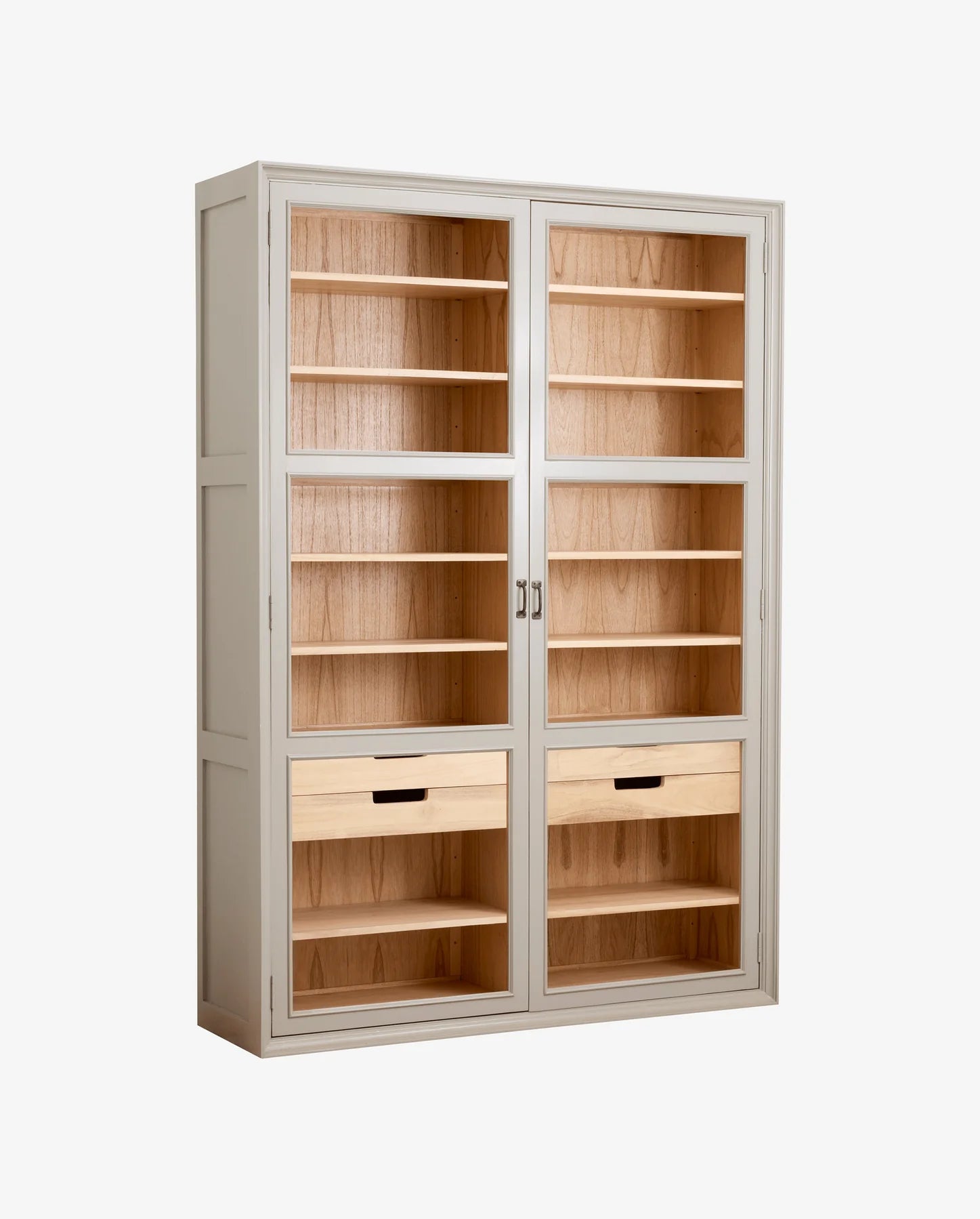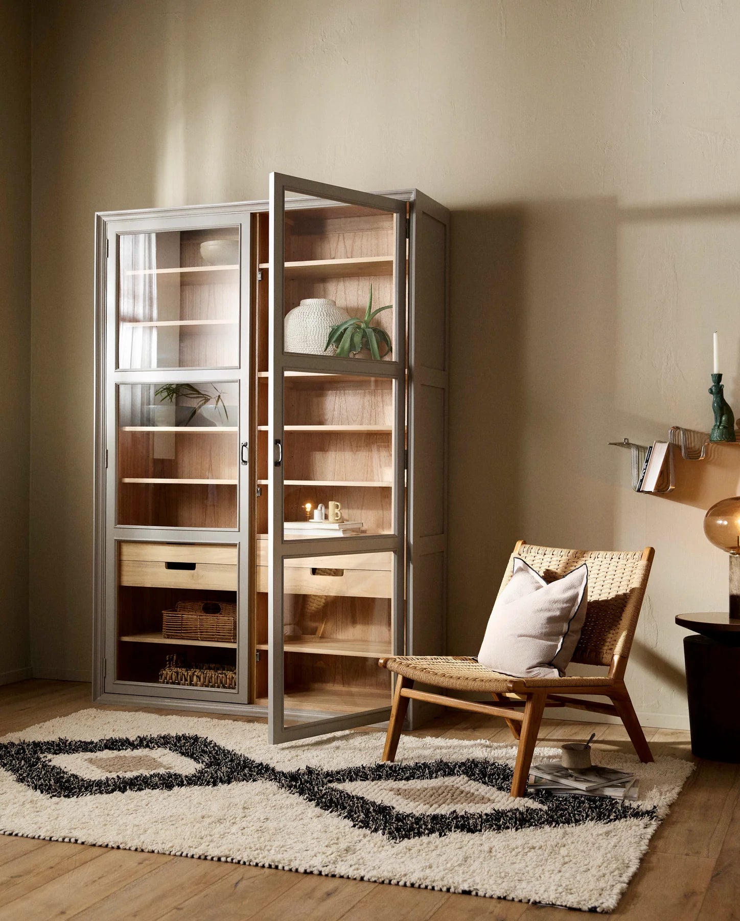 Upptäck vitrinskåpet Viva från Nordal. En perfekt balans mellan modern elegans och klassisk design. Med sina glasdörrar och grå ram, kombinerat med en insida klädd i träfanér, presenterar skåpet dina favoritföremål på ett sofistikerat och stilfullt sätt. Den stilrena grå inramningen skapar ett lugnt och elegant uttryck som framhäver innehållet och ger möbeln en subtil arkitektonisk karaktär. Tack vare sin tidlösa design passar vitrinskåpet VIVA lika bra i vardagsrummet som i köket, matsalen, kontoret eller hallen.
