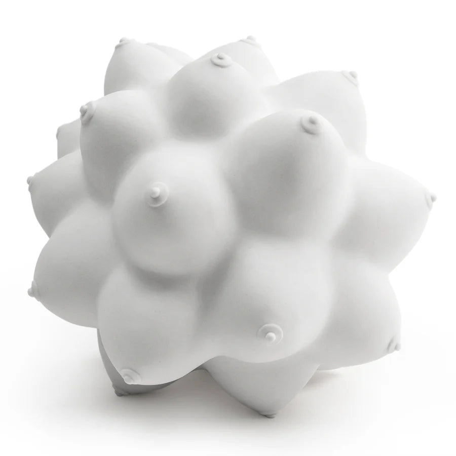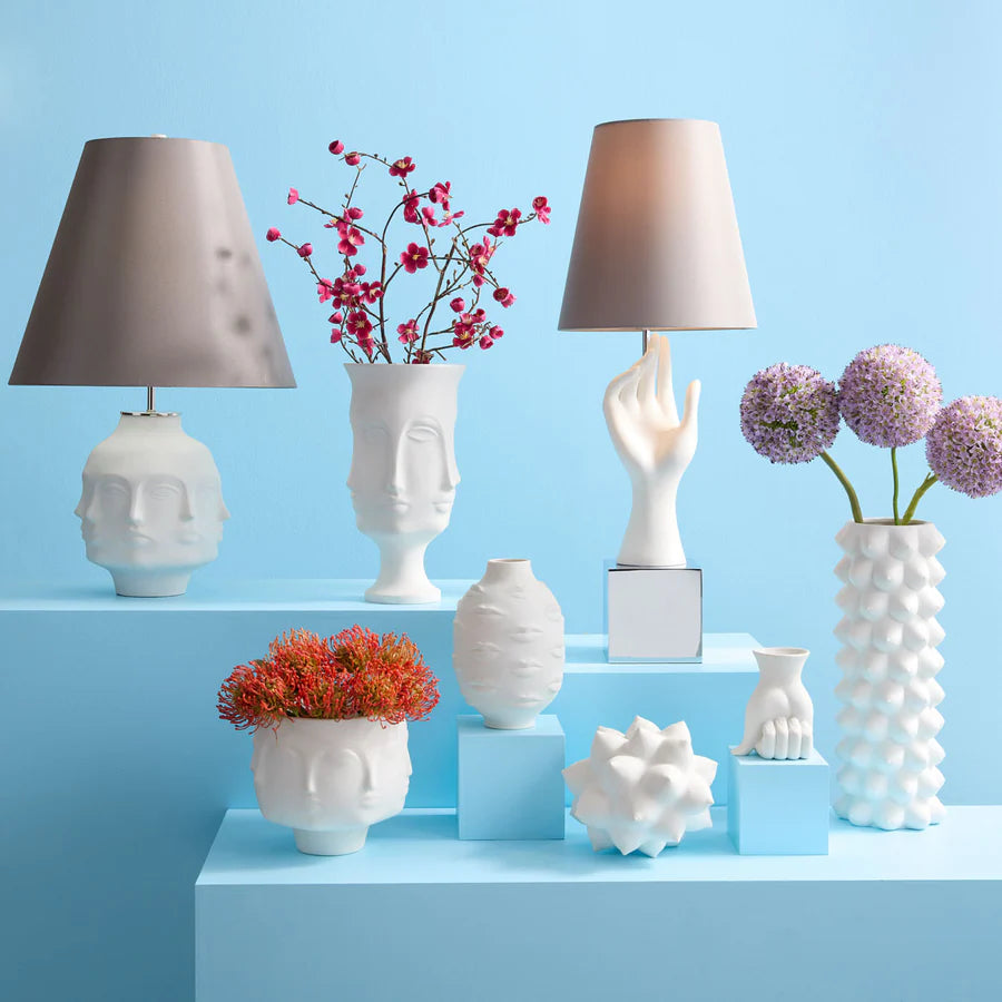 Jonathan skulpterar och drejar modellerna till vår Muse-keramik och ersätter sedan våra ikoniska geometriska reliefmönster med kroppsliga former – ansikten, bröst, läppar – för att skapa ett surrealistiskt uttryck. Varje föremål är en hyllning till våra favoritkonstnärers musor.